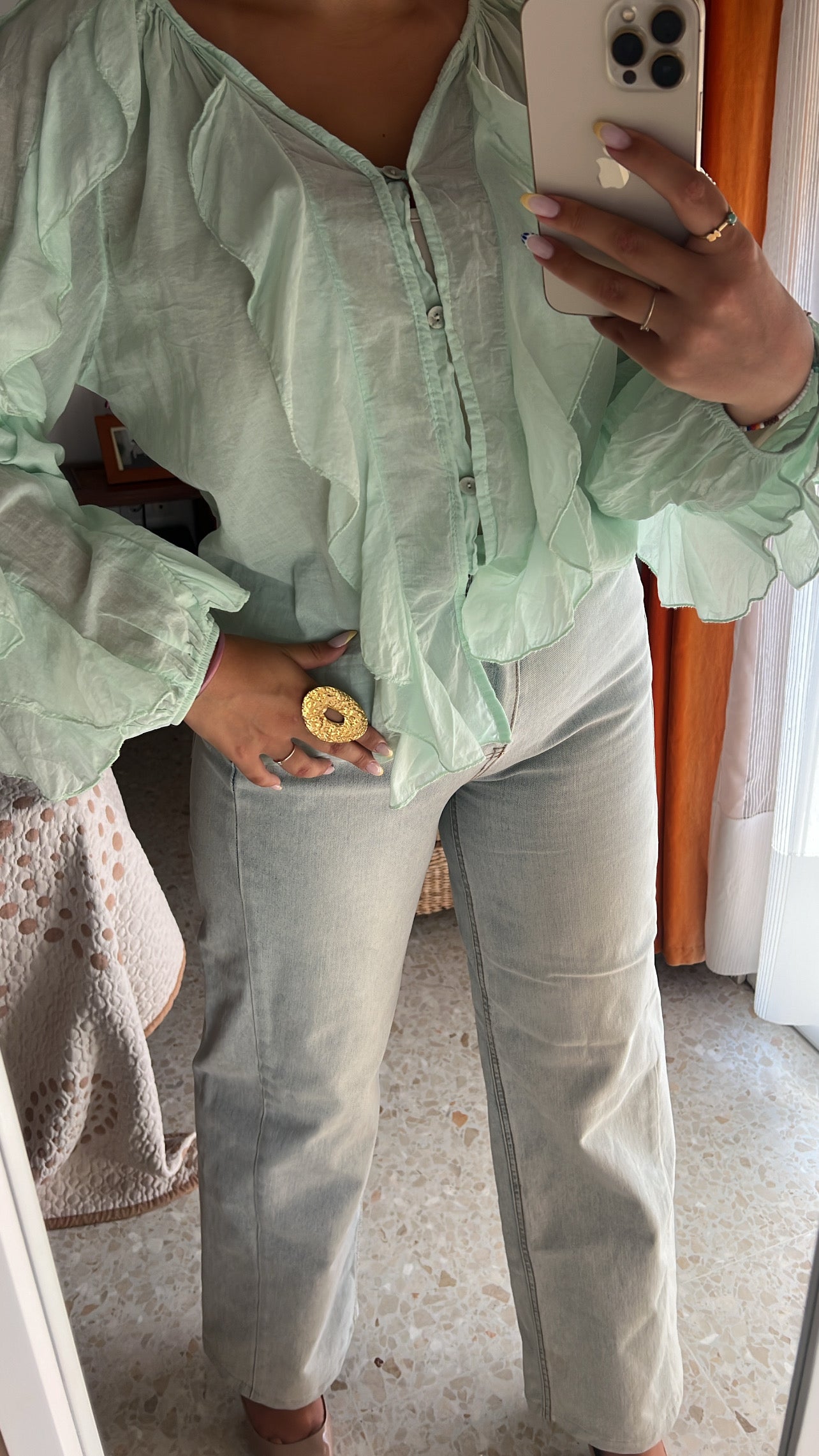 Blusa verde agua con transparencia y volantes, talla única (36-42). La modelo mide 1,63cm.
