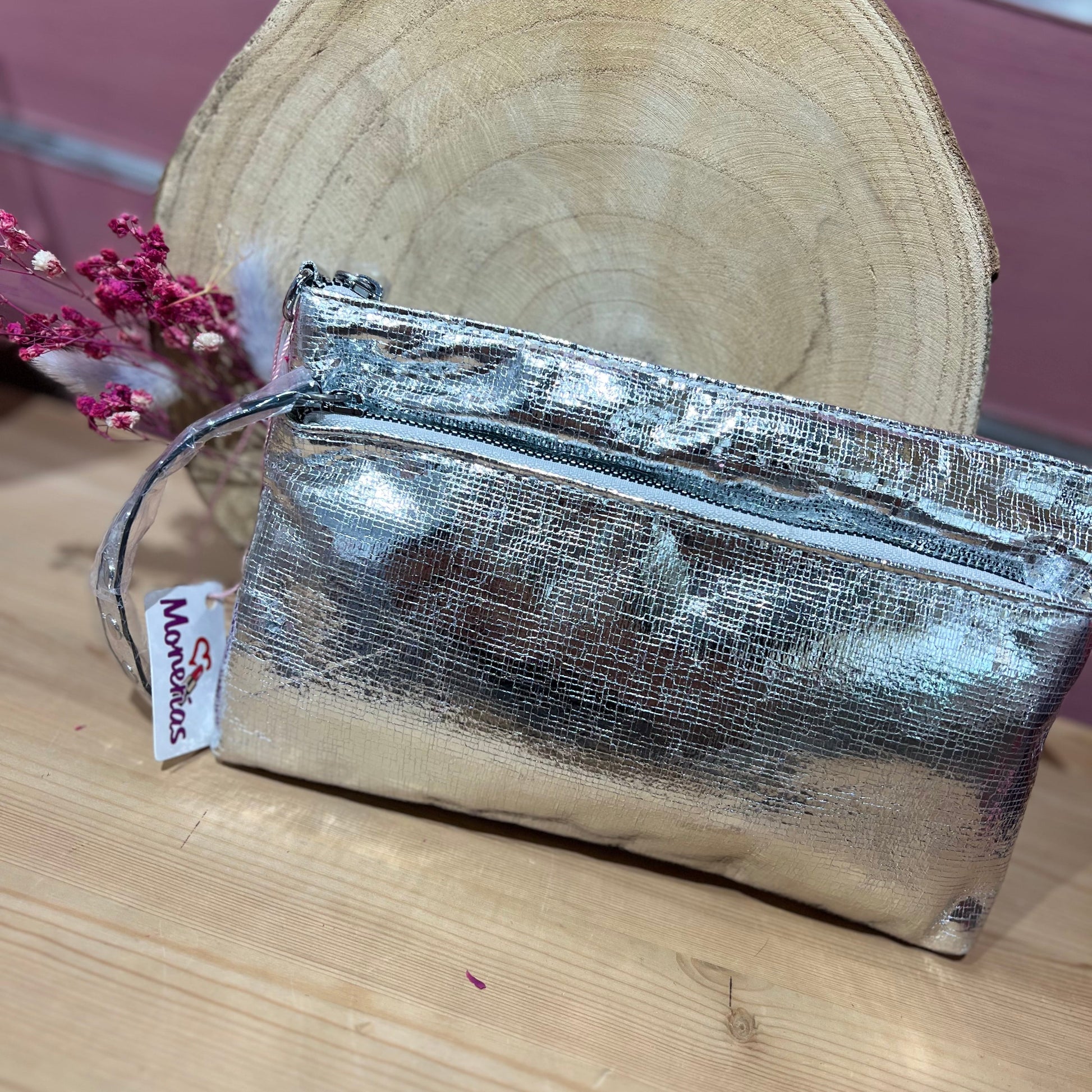 Bolso con doble bolsillo, dos posiciones de mano y colgado. El asa lleva tachuelas.