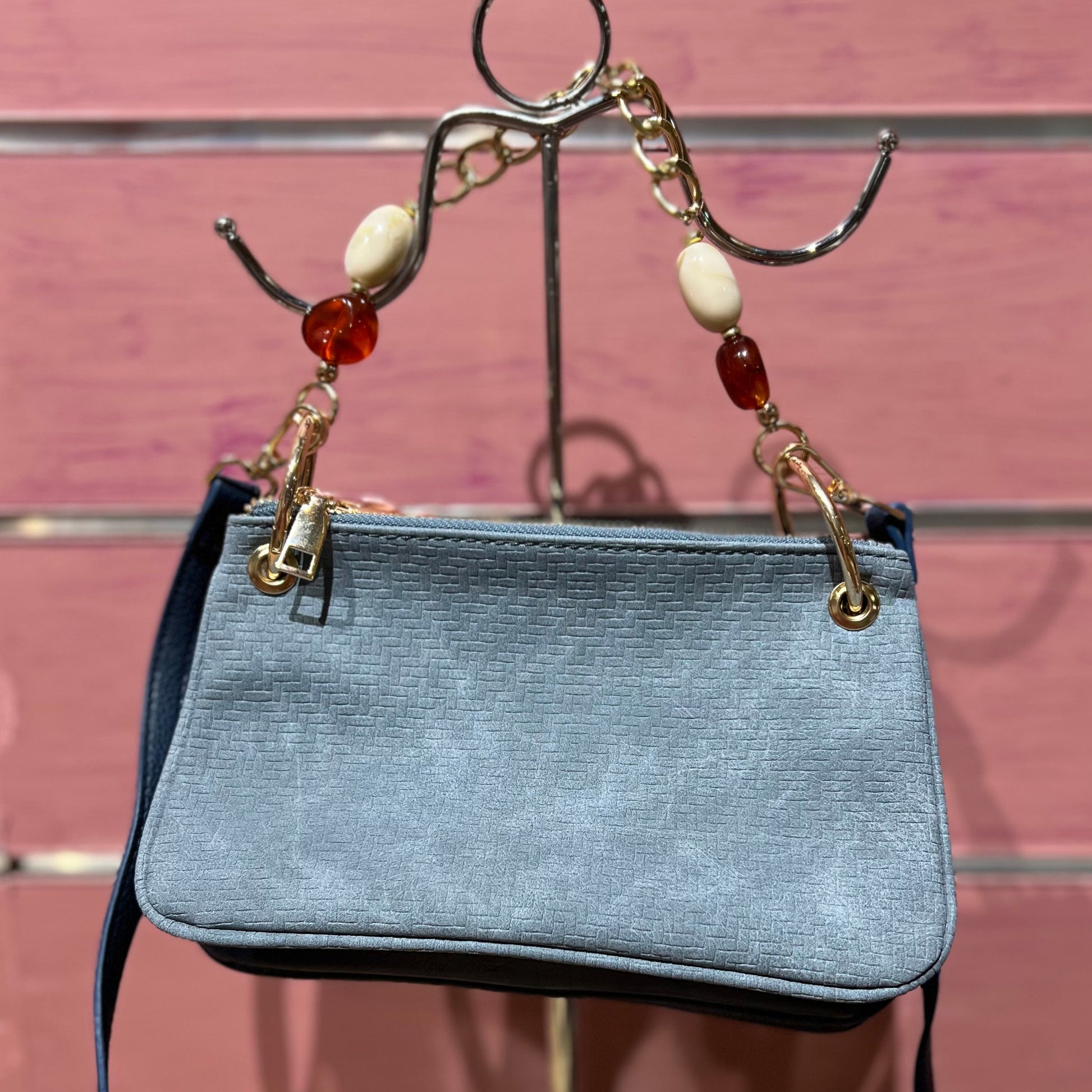 Bolso en tres tonos de azul, dividido en tres compartimentos y asa con piedras.