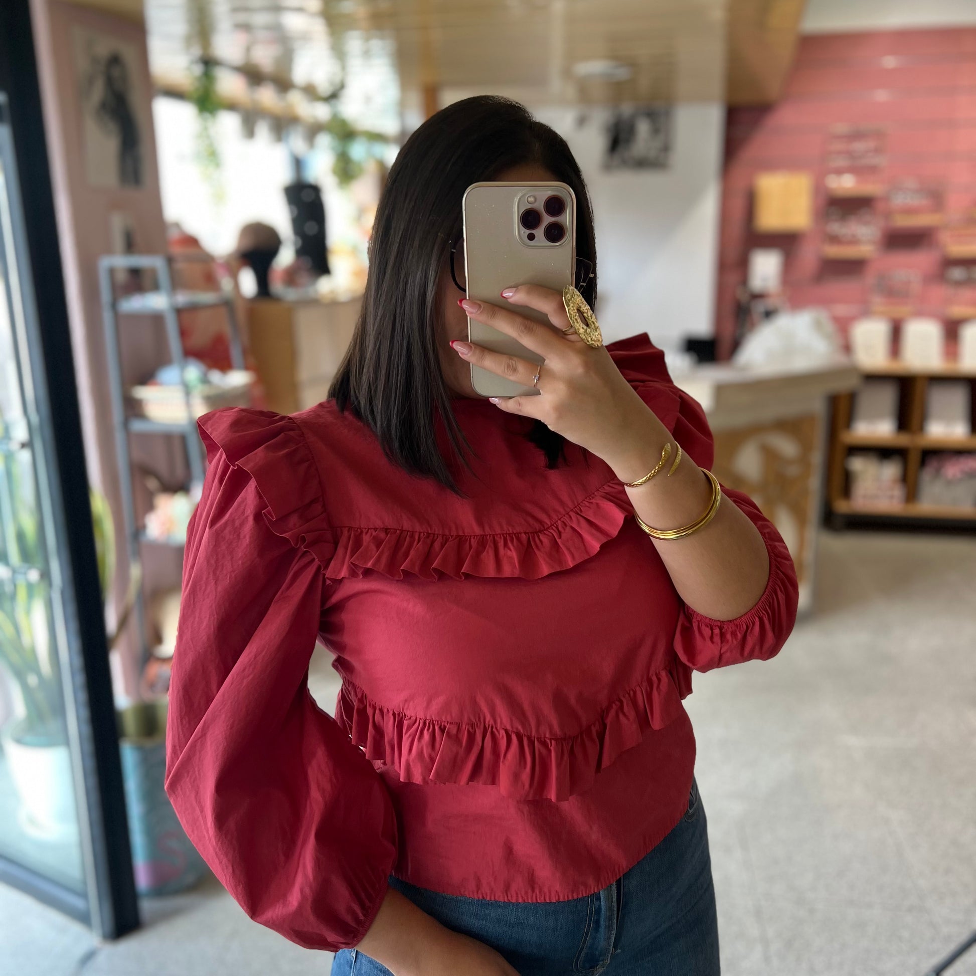 Camisa Venecia fluida con volantes en el pecho y hombros. Elegante, femenina y cómoda. Talla única adaptable de la 36 a la 42.