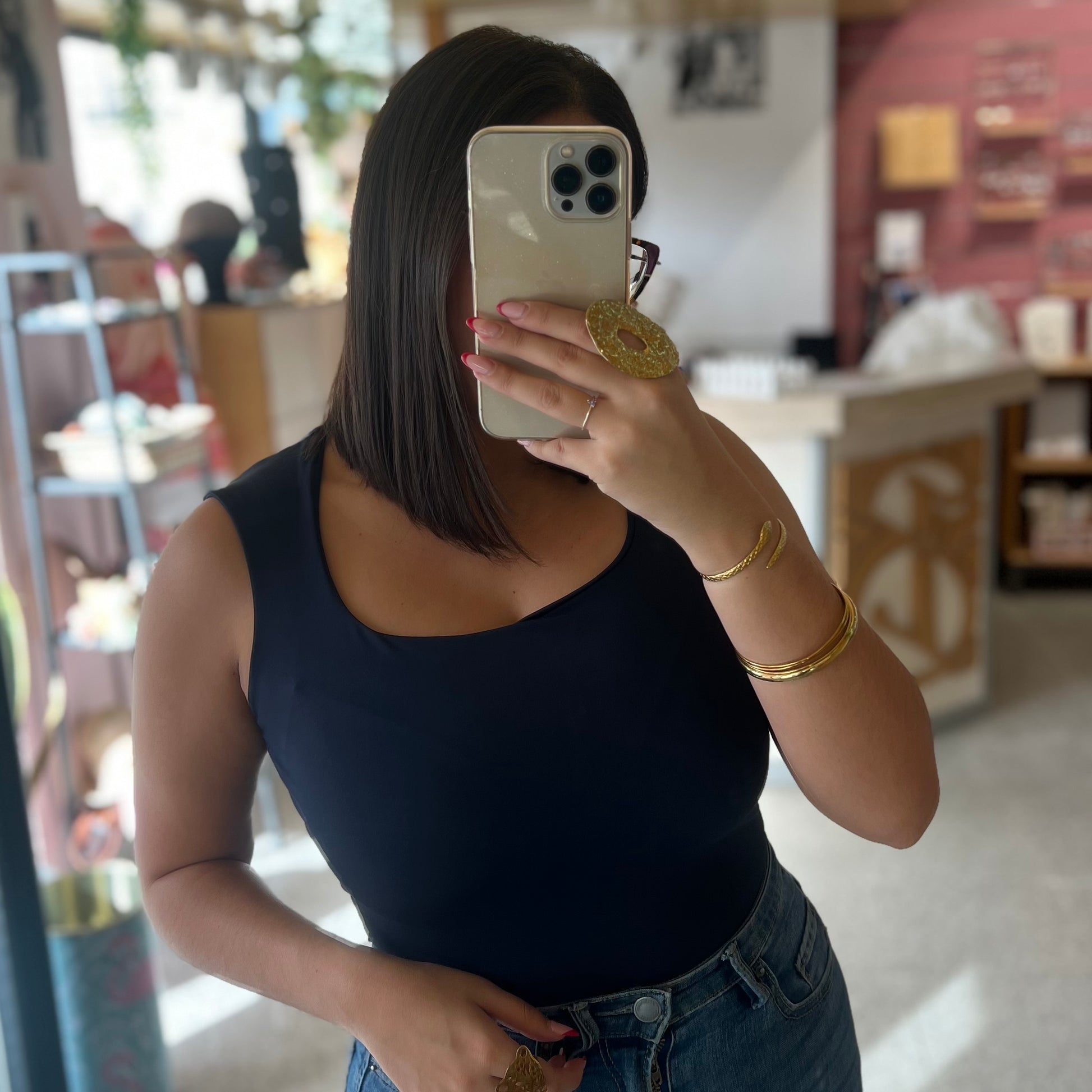 Camiseta básica de licra, escote cuadrado y manga sisa.