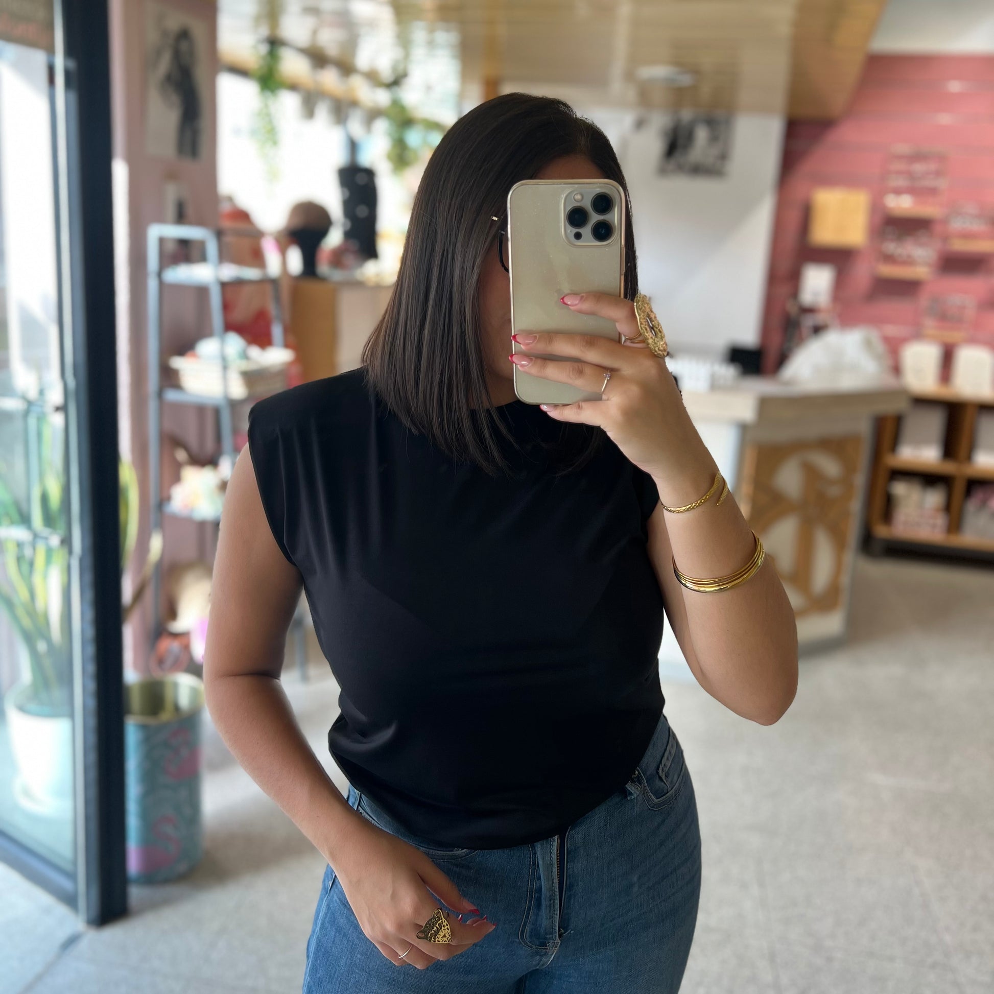 Camiseta con hombreras, cuello redondo y manga sisa. Talla única (36-42). Las medidas son sin estirar (aproximadamente): largo - 55cm y ancho - 45cm. La modelo mide 1,63 cm y utiliza una talla 38 de normal.
