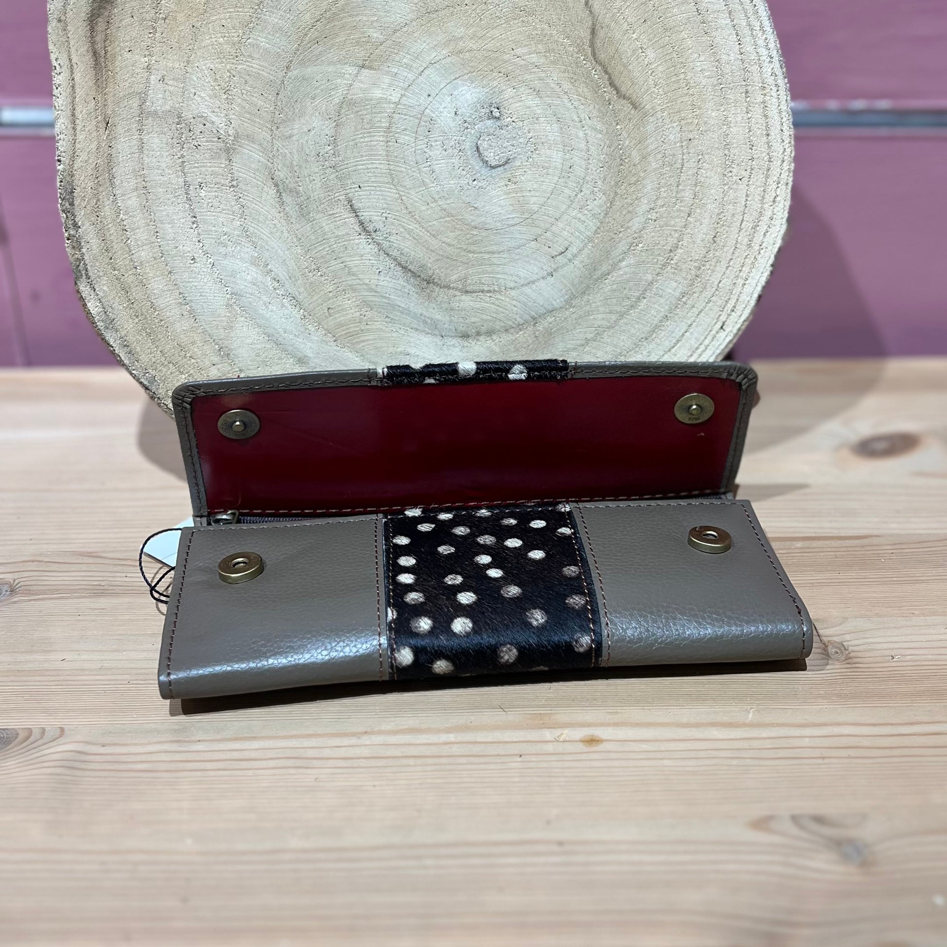 Cartera de piel con pelo sintético, en el interior tiene varios compartimentos.