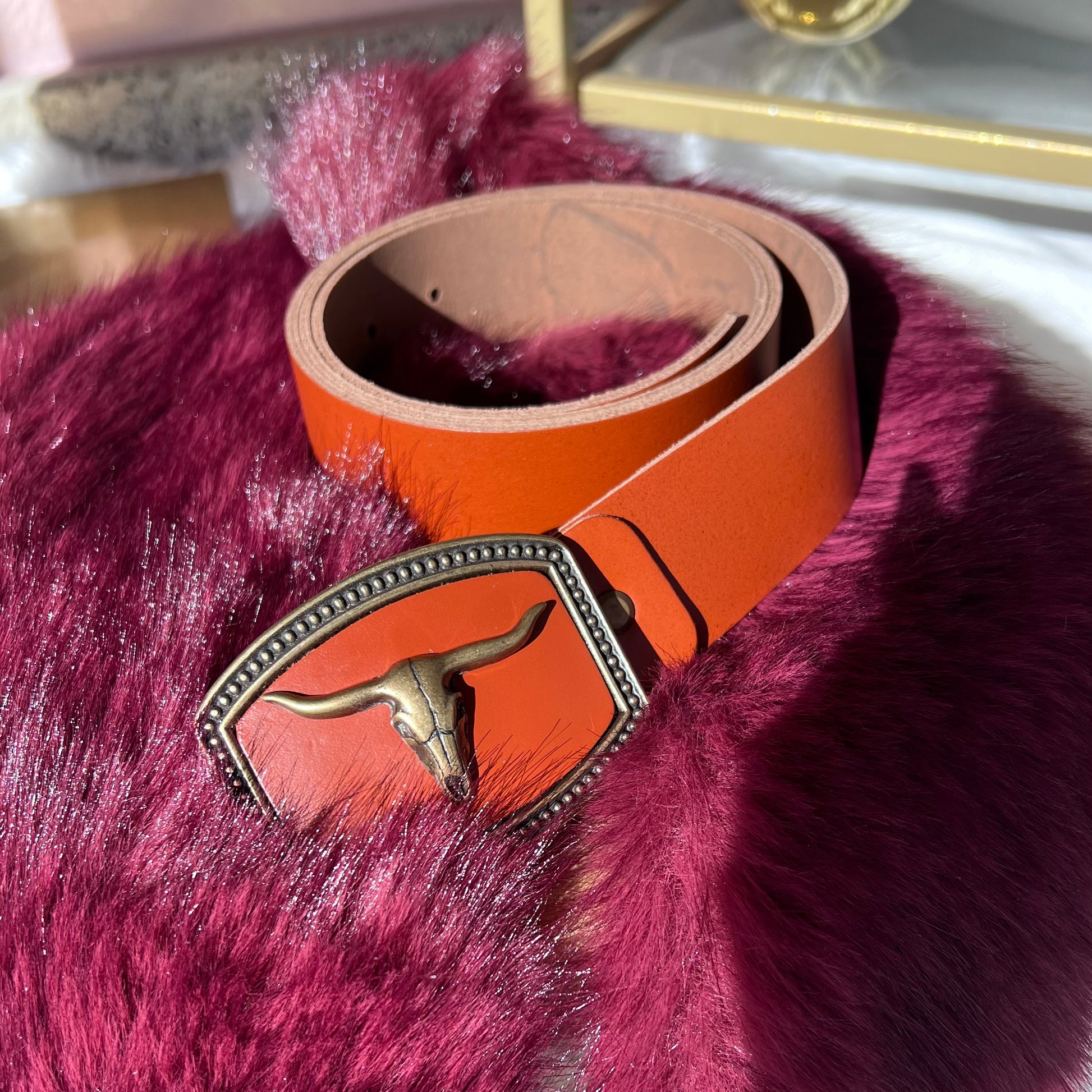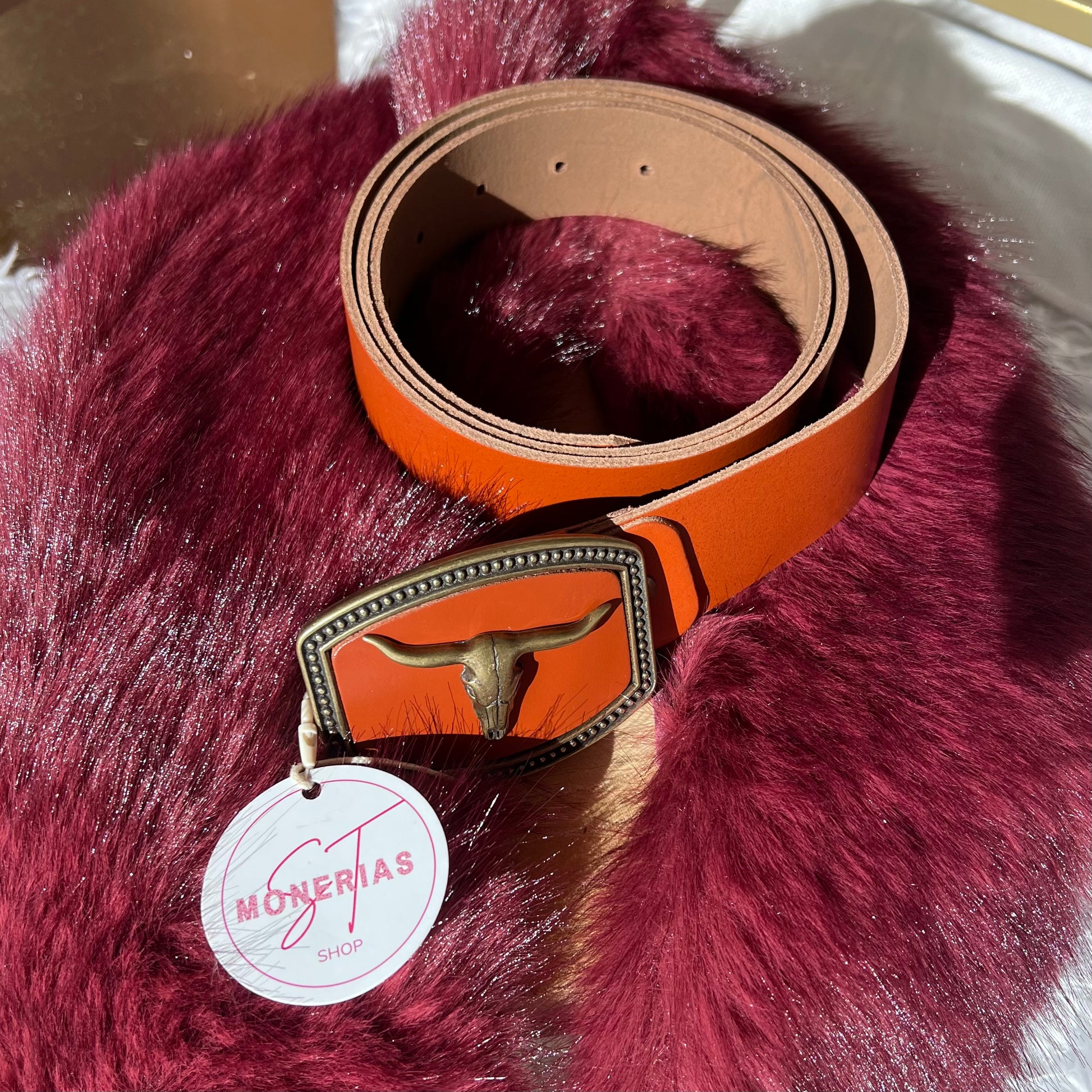 Cinturón de piel con hebilla metálica cráneo de toro. Mide 105 cm y se arregla a las tallas inferiores. Diseño resistente, moderno y perfecto para elevar cualquier outfit.