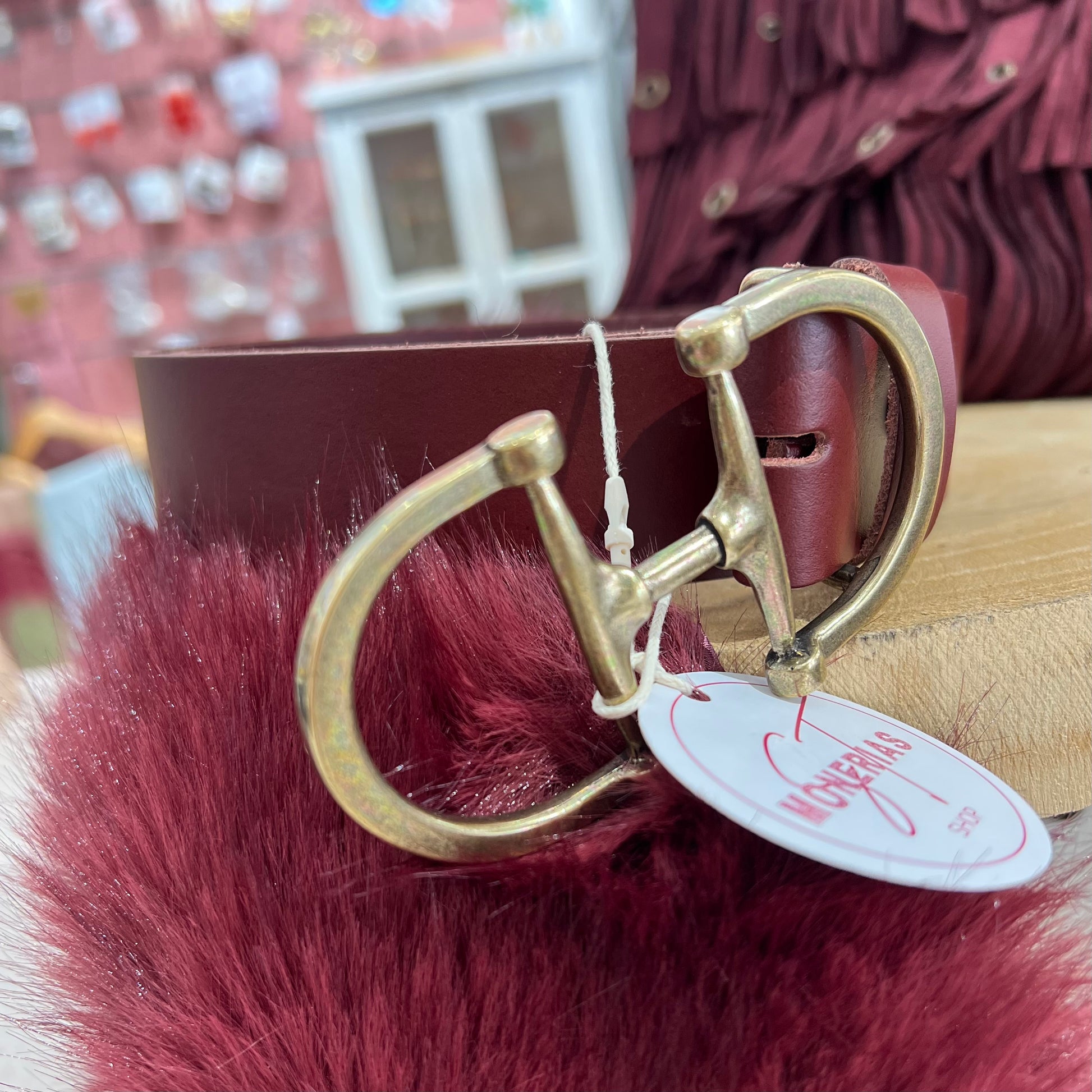 Cinturón de piel burdeos de 105 cm con hebilla de bocado, elegante, resistente y perfecto para elevar cualquier look. Fabricado en piel de alta calidad y ajustable, ya que se puede cortar y adaptar a todas las tallas. Un accesorio versátil y sofisticado para combinar con estilos casual o chic.