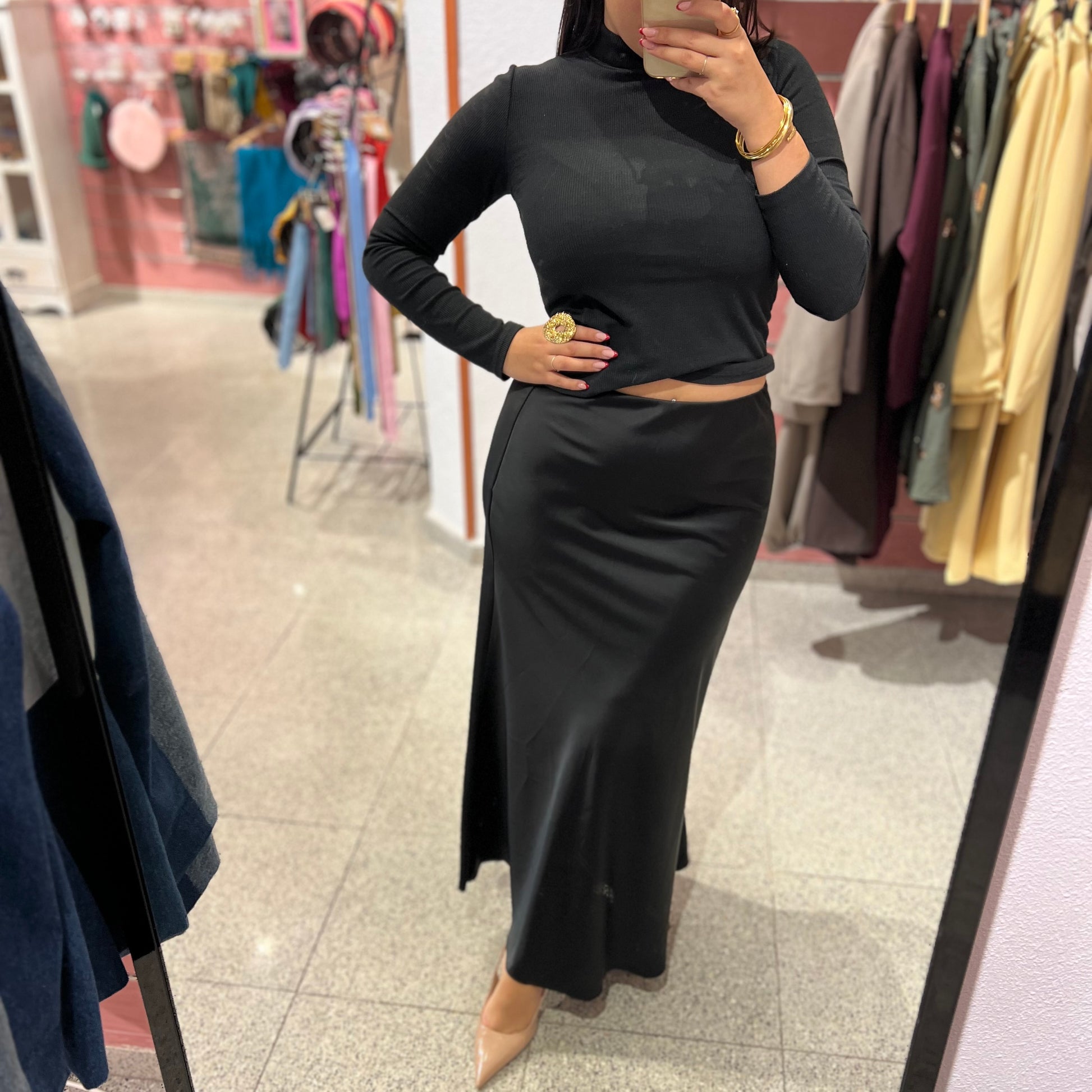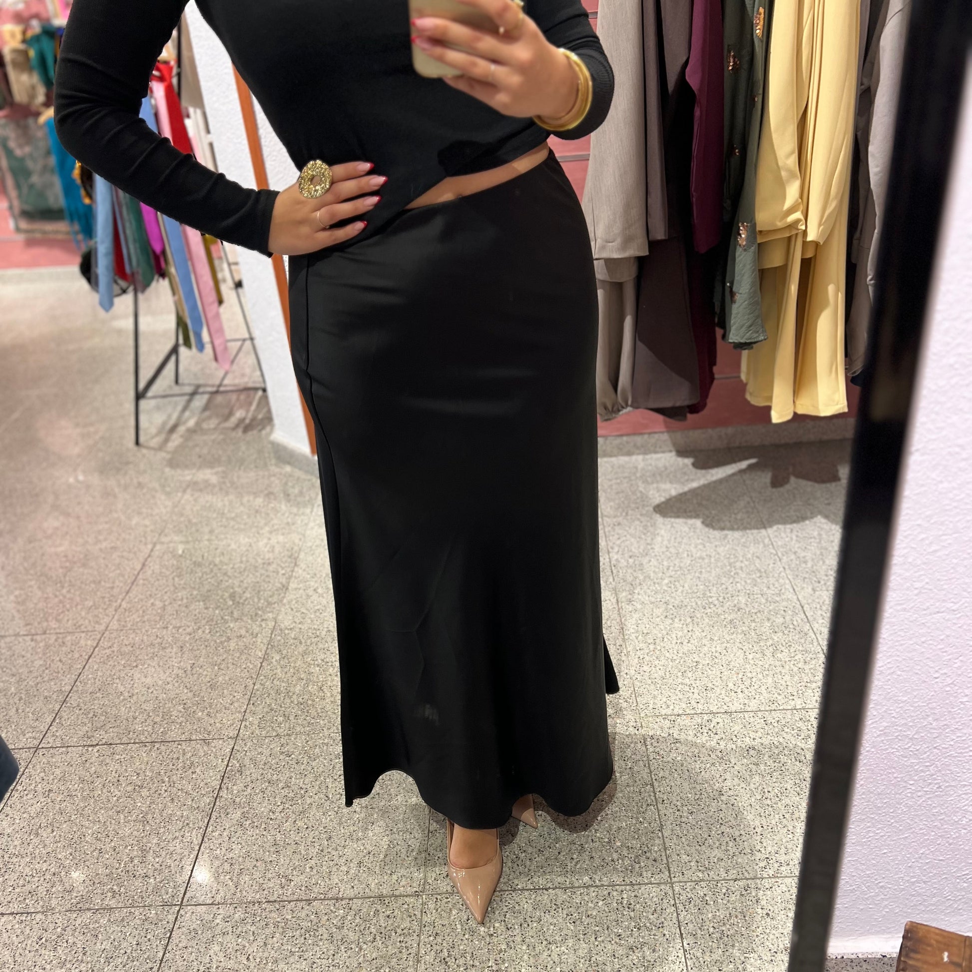 Falda satinada negra, con cintura elástica, talla única (36-42).