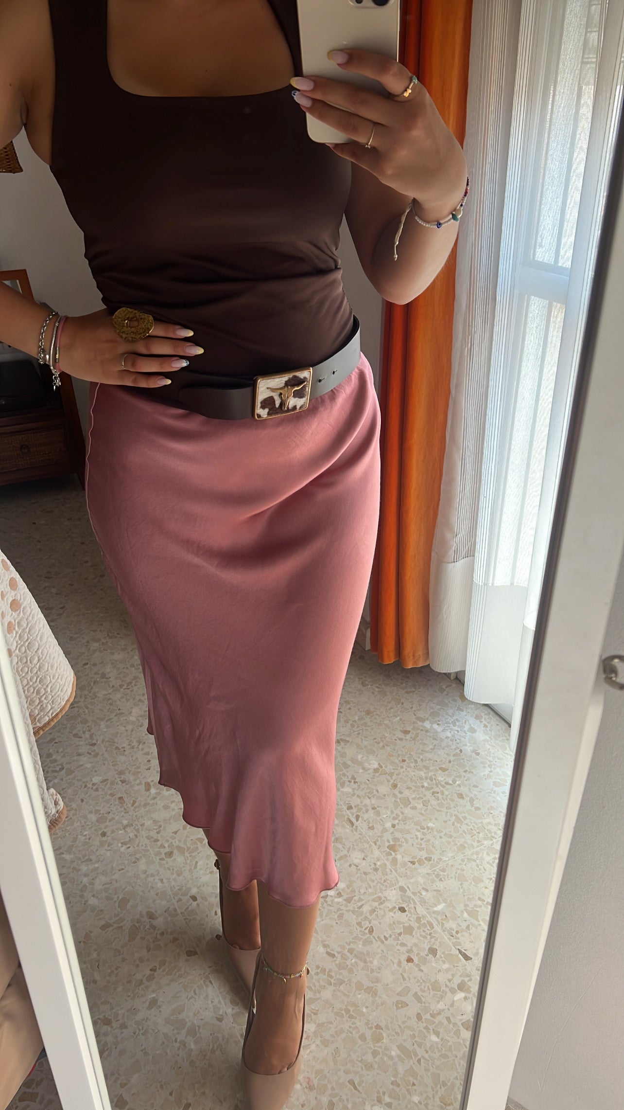Falda midi satinada en color rosa bebé. Talla única 36-40. La modelo mide 1,63cm.