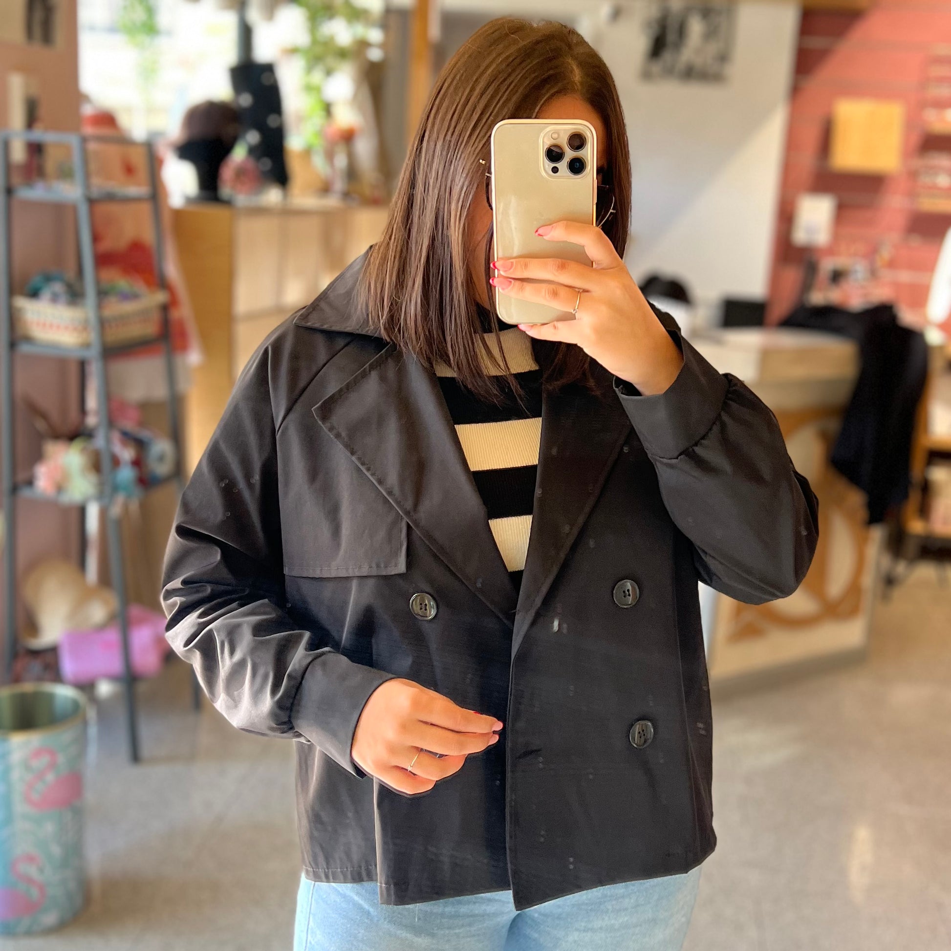 Gabardina corta negra, con capa en la parte posterior y cuello, se ajusta en la cintura. Talla única (38-44).