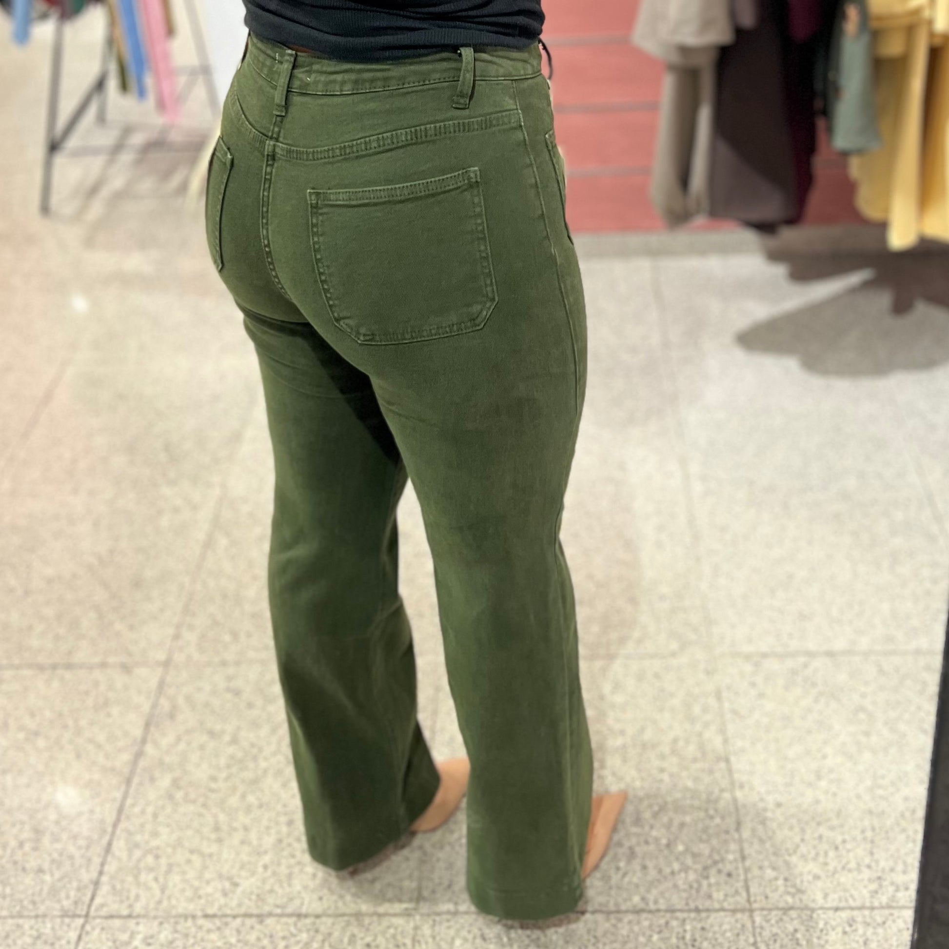 Vaquero en color verde, abotonado y con los bolsillos delanteros. Es de corte amplio y favorecedor, diseñado para alargar la silueta y aportar comodidad.