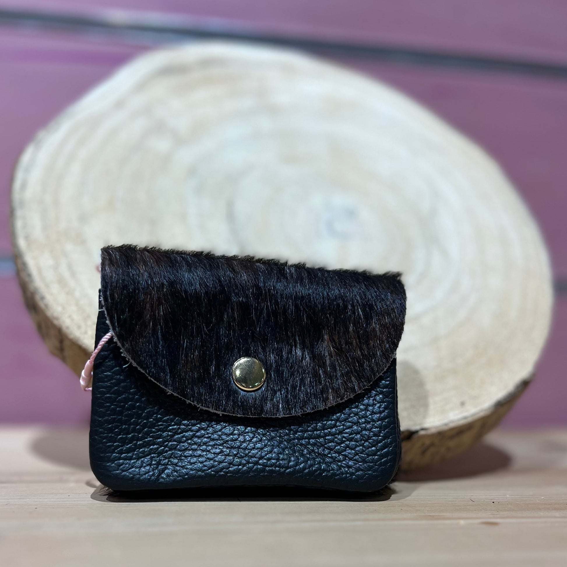 Monedero de piel con pelo sintético, tiene dos compartimentos uno de ellos con cremallera.