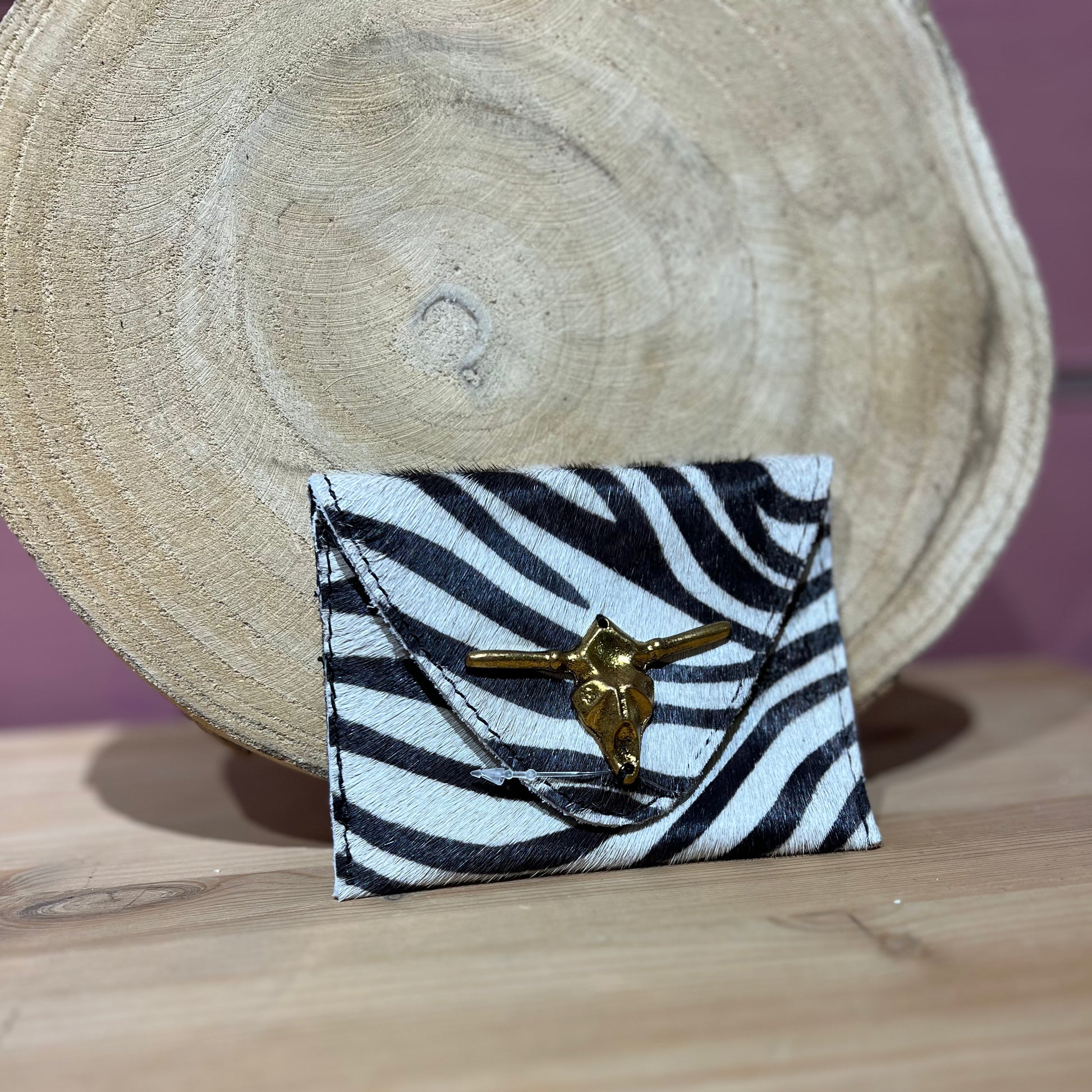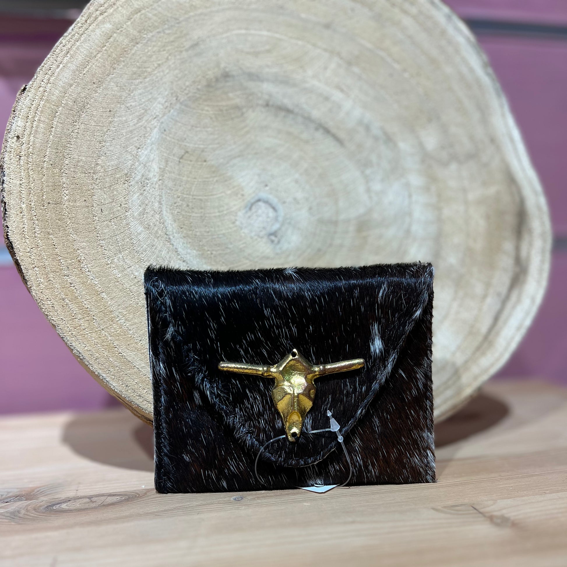 Monedero de piel con pelo sintético y detalle dorado de cráneo de toro.