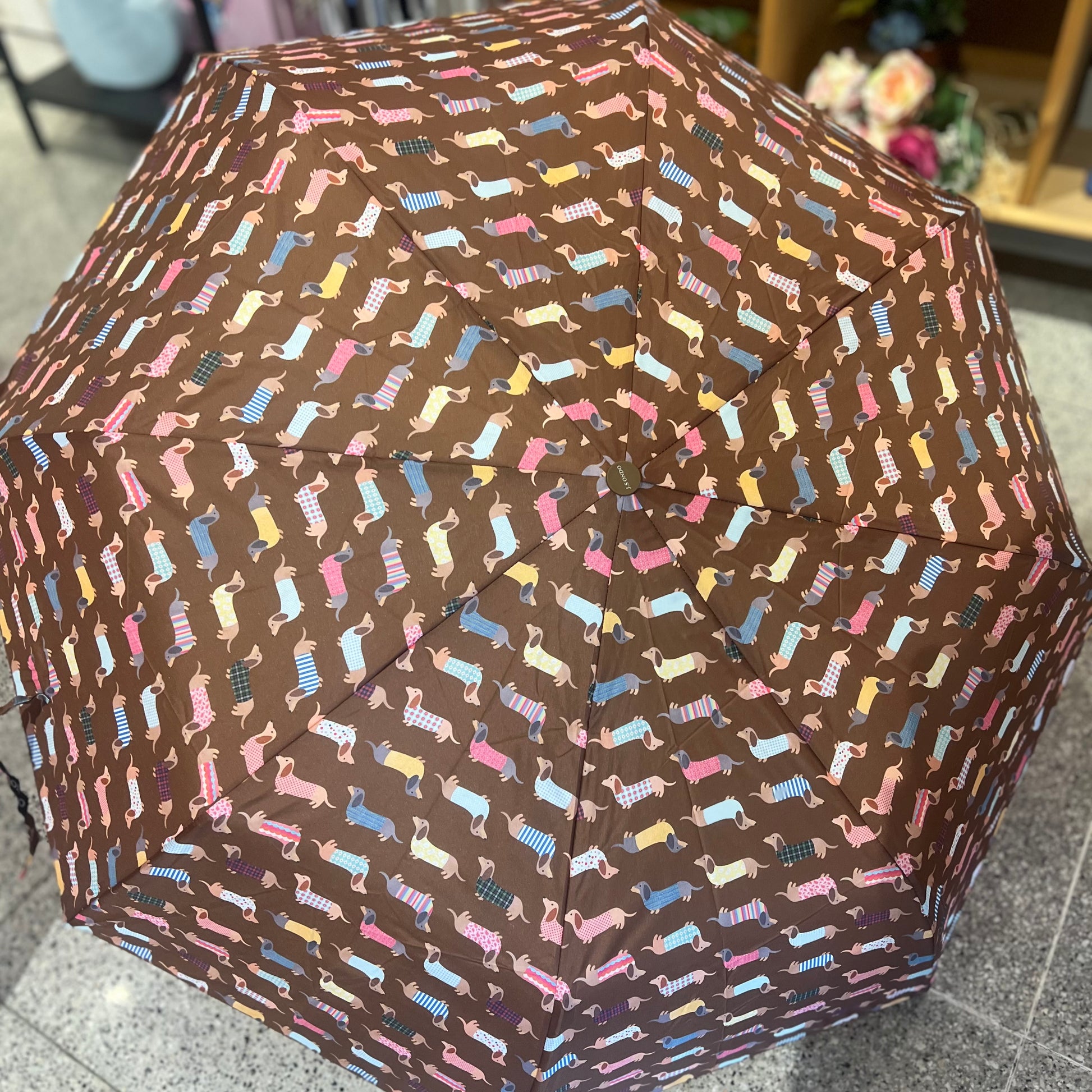 Paraguas de bolso perro salchicha en color marrón, ideal para el bolso y con fácil apertura por botón.