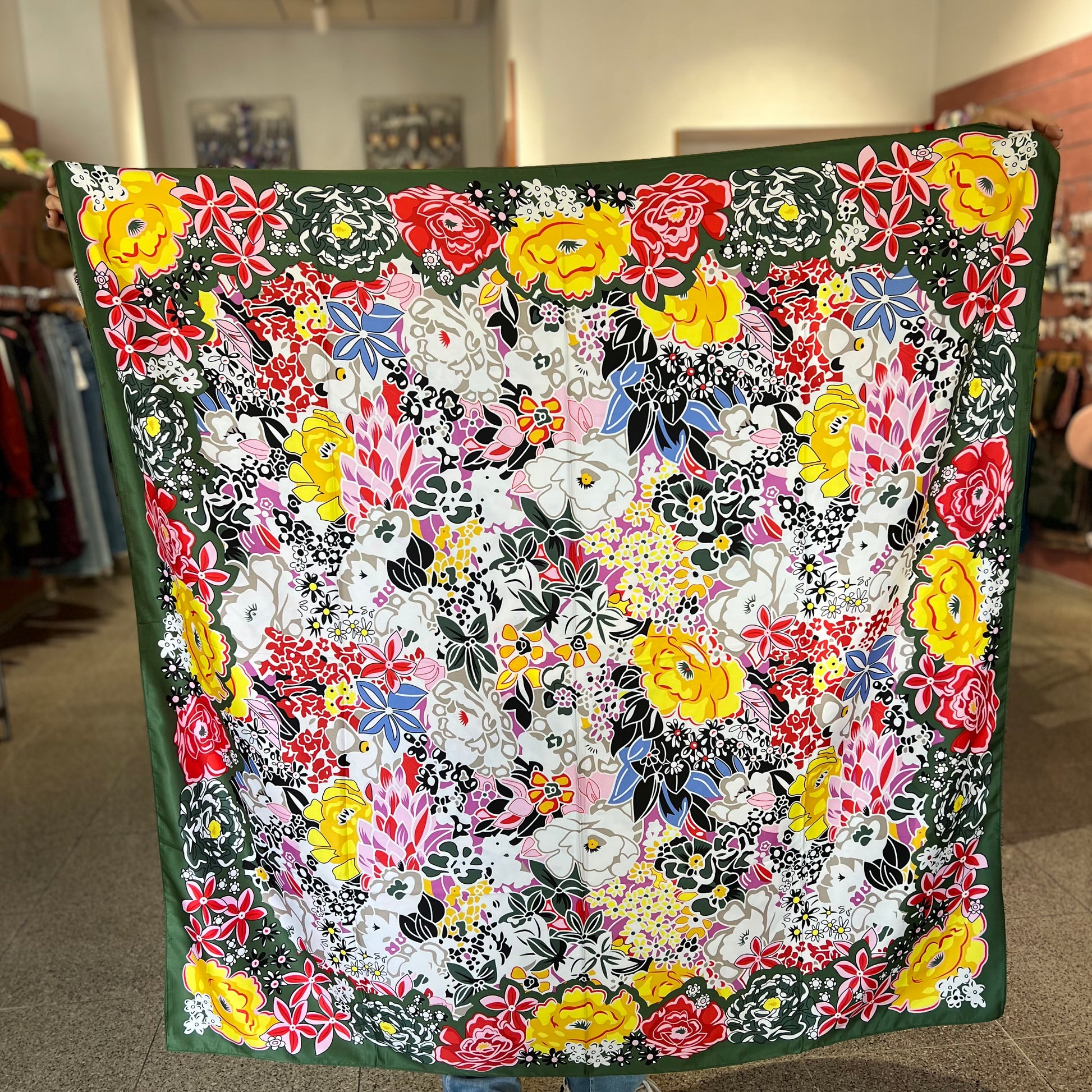 Satén con bordes verdes y flores en tonos amarillo, rojo y azul. Medida 130×130 cm.