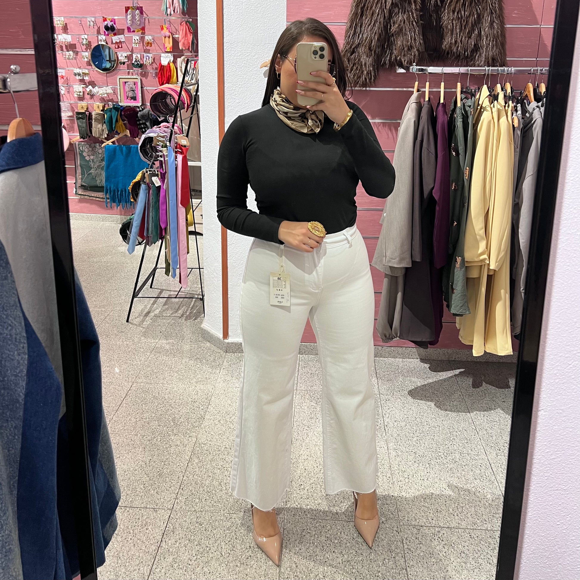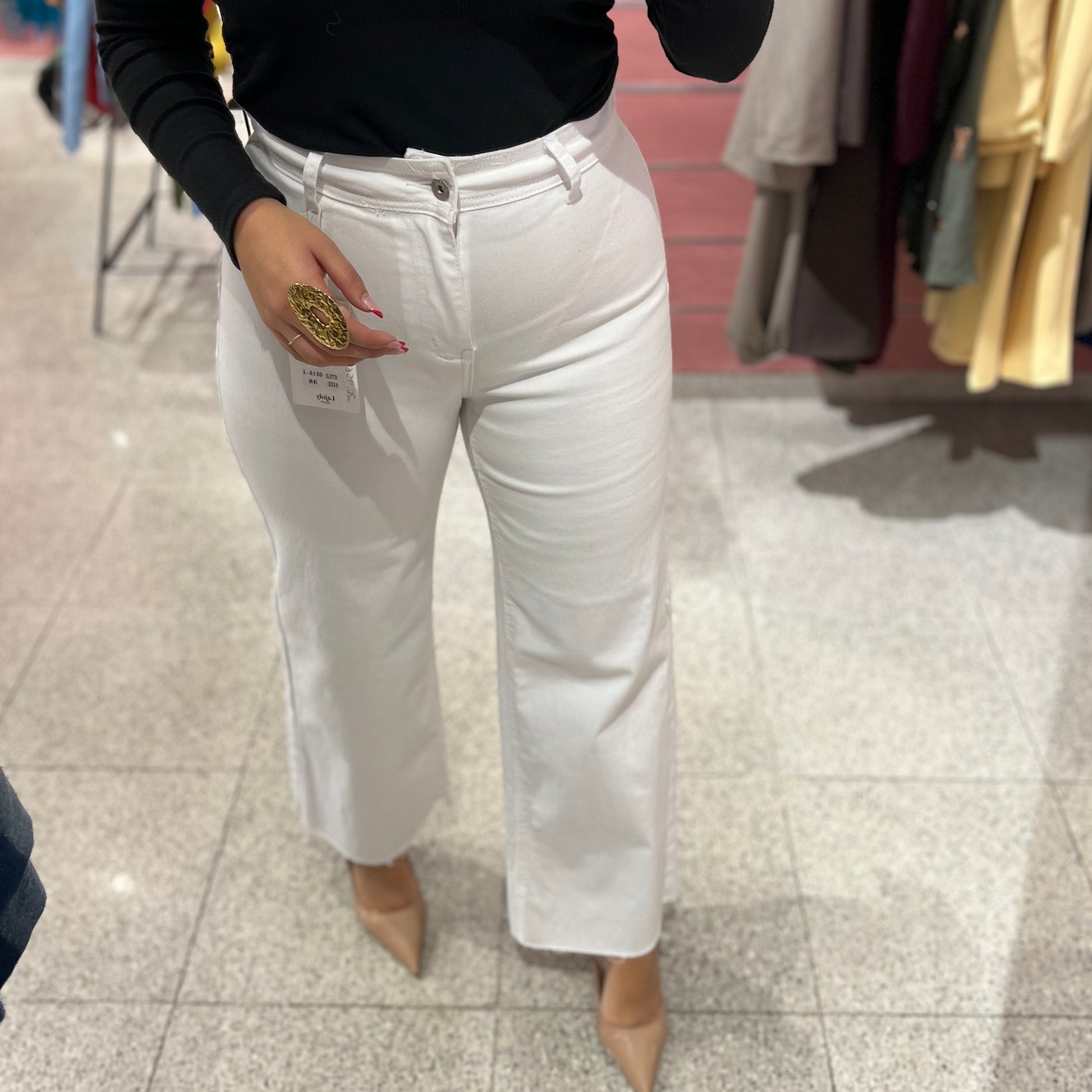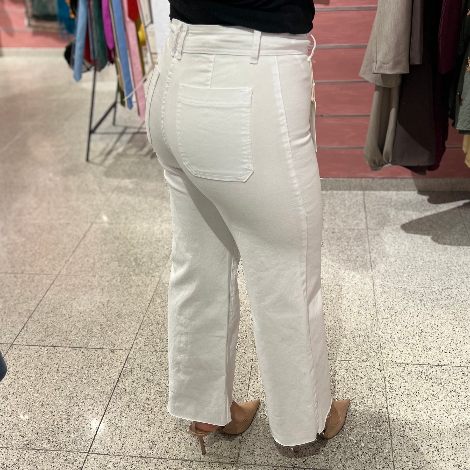Tejido elástico, ajustado en la pierna y finaliza en campana deshilachado.